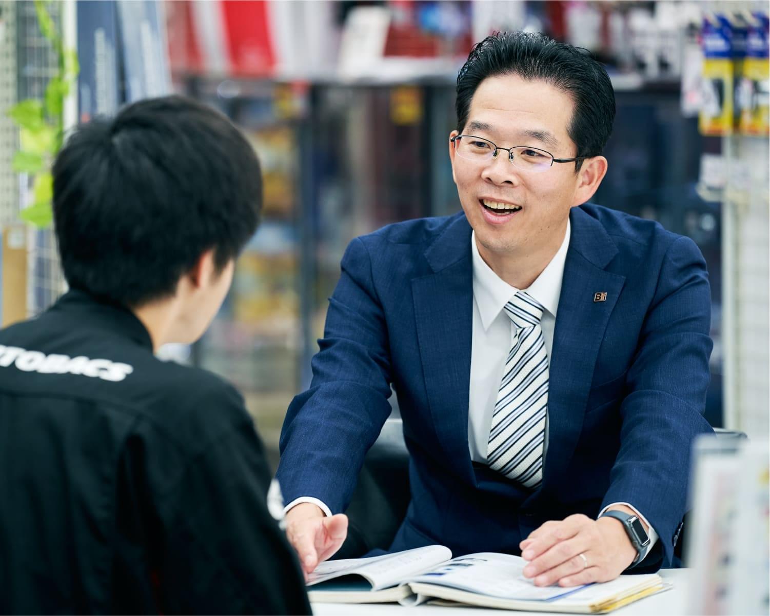 入社1年目に店舗配属された当初、「これを着て挑戦してみて」と店長から渡されたのは、[バッテリー点検無料実施中!]と書かれたビブスでした。当時は右も左もわからないなかでも、全力で取り組むことだけは決めていました。結果、バッテリーの販売個数が1日平均5〜6個だったところ、1日で20〜30個ほど販売できたことが最初の成功体験となりました。タイヤ販売を任された際も、店舗の年間販売記録を更新することができました。成果を上げるごとに、主任、フロア長、店長代行と昇格し、29歳で店長に就任。「一生懸命やっていれば評価されるんだな」と当時から思っていました。ただ、評価されたいというより、仲間との切磋琢磨が楽しく、その勢いでキャリアを築いてきたというほうが感覚としては近いです。他店舗の同期に電話してお互い「負けないからな!」なんて言い合いながら、スポーツの試合をするように働く日々が、充実感につながっていました。