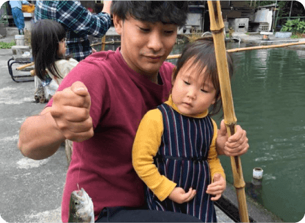 写真は、家族と車で秩父まで行き釣り堀でイワナを釣ったときの一枚。このあとおいしくいただきました。他にもぶどう狩りに行くなど、休日は家族と過ごすことが多いですね。